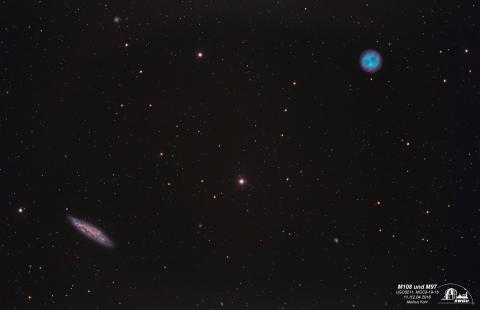 Die Galaxie Messier 108 und der sog. Eulennebel Messier 97 sind zwei völlig unterschiedliche Objekte im Sternbild Großer Bär (Ursa Major). Sie stehen nur in scheinbar gleicher Richtung am Himmel und sind sehr unterschiedlich weit entfernt.