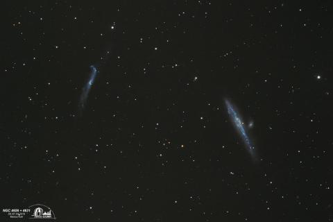 Die "Walgalaxie" NGC 4631, ist eine Balken-Spirale in einer Entfernung von etwa 28 Millionen Lj. Ihre scheinbare Helligkeit beträgt 9,0 mag, ihre Winkelausdehnung 15,2′ × 2,8′. (Im Bild liegt sie rechts)